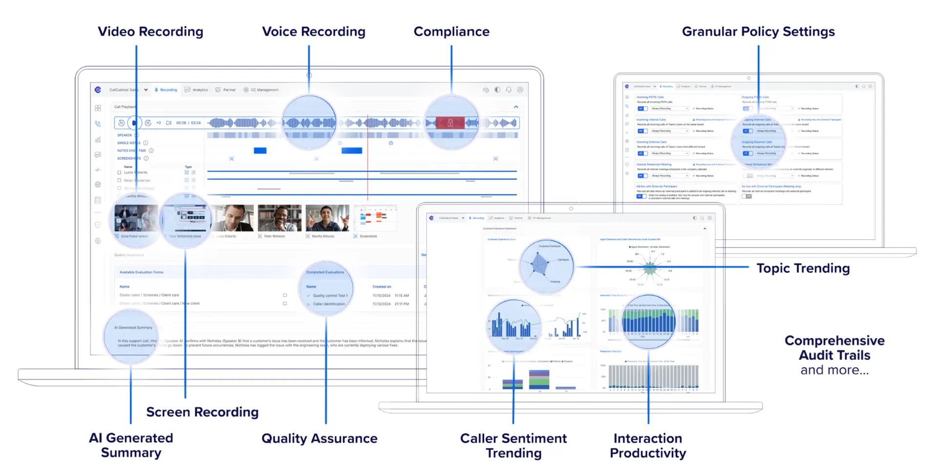 Analyze every calling, conferencing, and contact center conversation from a single solution. CallCabinet’s enterprise-class call recording analytics with AI-enabled analysis and intelligence deliver operational and departmental efficiency insights. These insights drive positive growth across organizations using easy-to-access, customizable business intelligence dashboards.